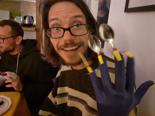 Le déroulé de celui-ci se faisait au dépend de lots distribués lors d'un loto qui débutait la soirée: un gant cuillère pour servir les convives, un doigt décapsuleur pour abreuver vos voisins... Au delà de tout ces rôles un peu spéciaux, l'idée était de nous munir de gants aux ongles de cuillères, de simple,double,triple piques ou de fourchettes pour participer au repas.